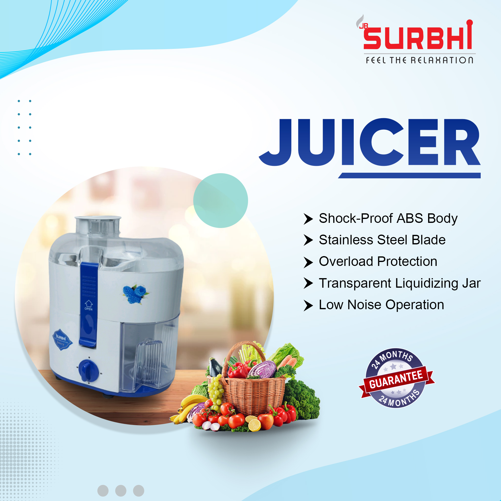 The Surbhi Pearl Juicer Mixer Grinder has a shock-proof ABS body, which makes it safe to use and easy to clean. It also features overload protection, which ensures that the motor is not damaged due to excessive use.