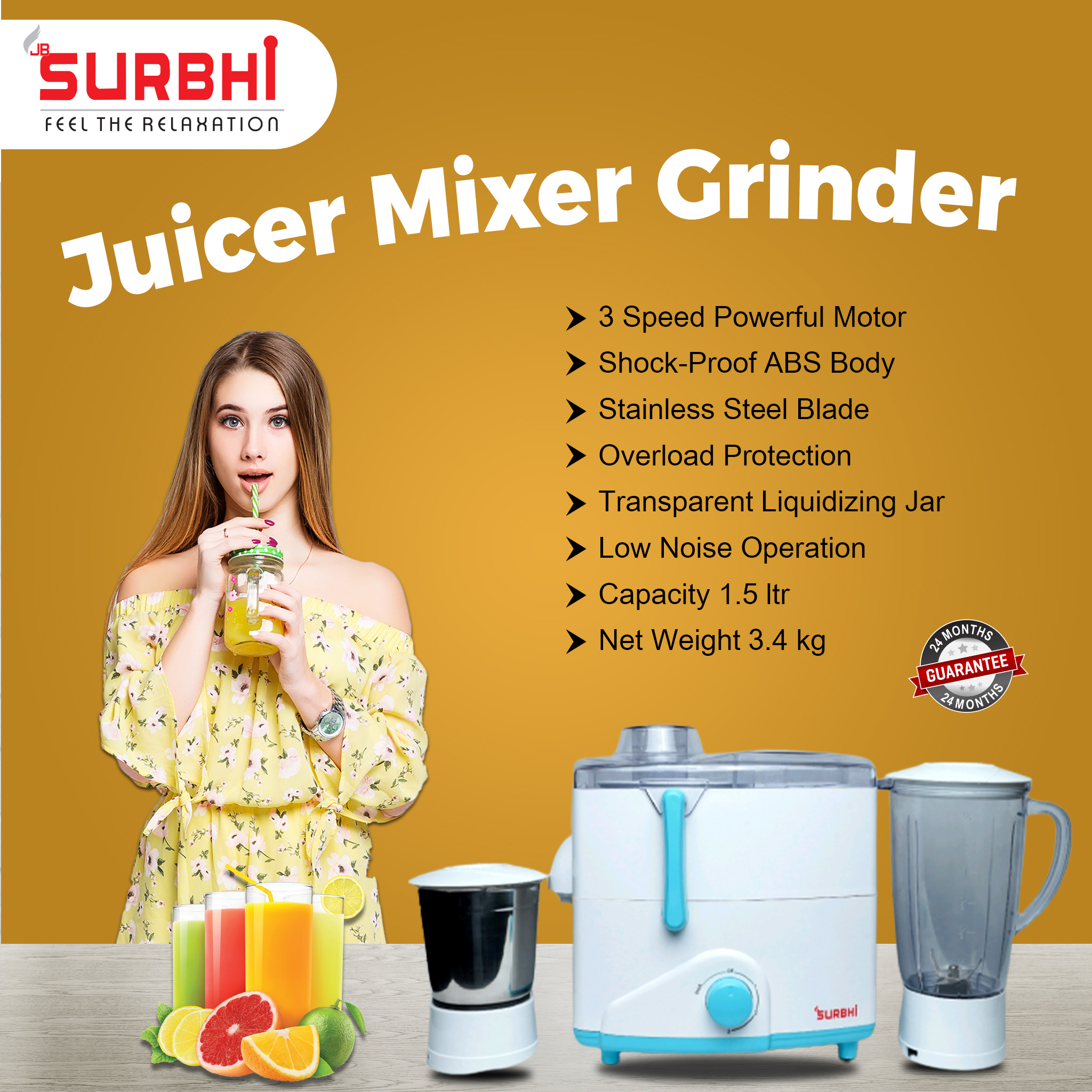 The Surbhi Pure Plus Juicer Mixer Grinder has a capacity of 1.5 liters and a net weight of 3.4 kg. It’s the perfect appliance to help you create delicious and healthy juices, smoothies, and chutneys for you and your family.